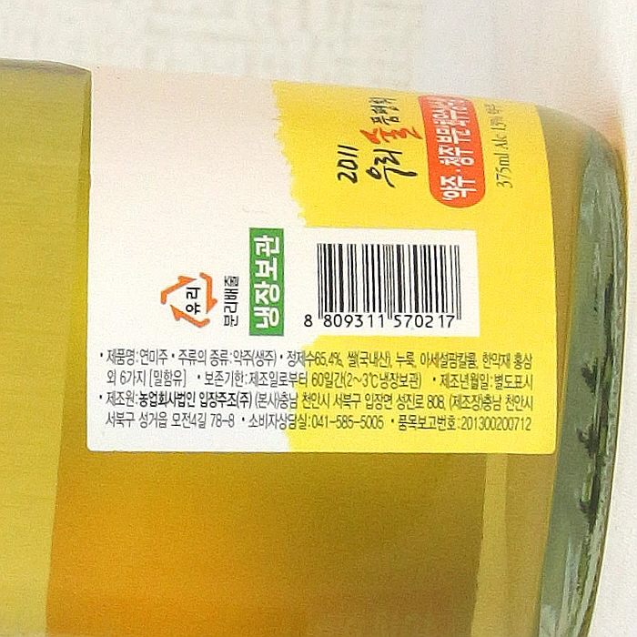 <!-- } SE-TEXT --><!-- SE-TEXT { -->원재료명 : 정제수65.4%, 쌀(국내산),누룩,아세설팜칼륨,한약재 홍삼외6가지 [밀함유]
